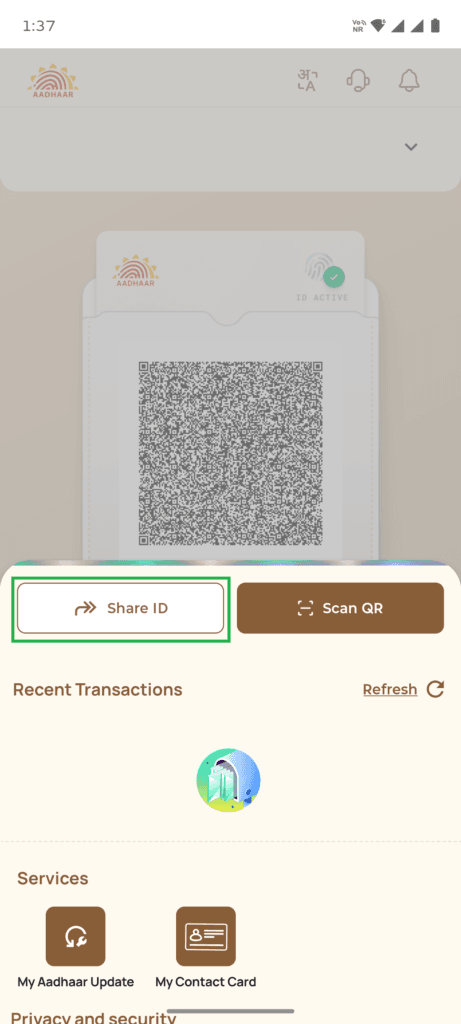 आधार ऐप से आधार कार्ड Download करने के लिए सबसे पहले Aadhaar App को लॉगिन करें। इसके बाद Share ID पर क्लिक करें।
